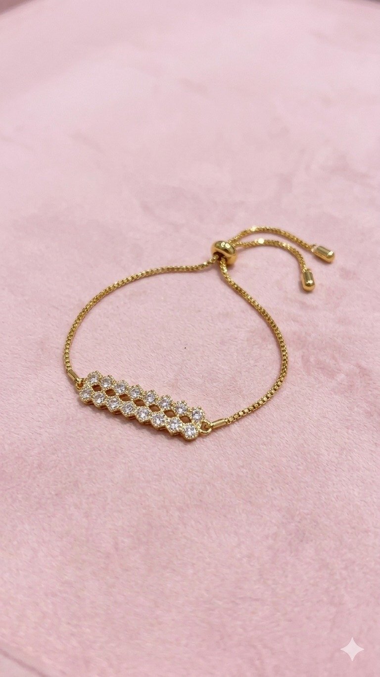 A stylish and elegant gold-plated bolo bracelet featuring a geometric bar centerpiece. The bar is intricately pavé-set with shimmering Cubic Zirconia (CZ) stones, offering a luxury look for any occasion. Designed with an adjustable slider chain for a perfect fit on any wrist.