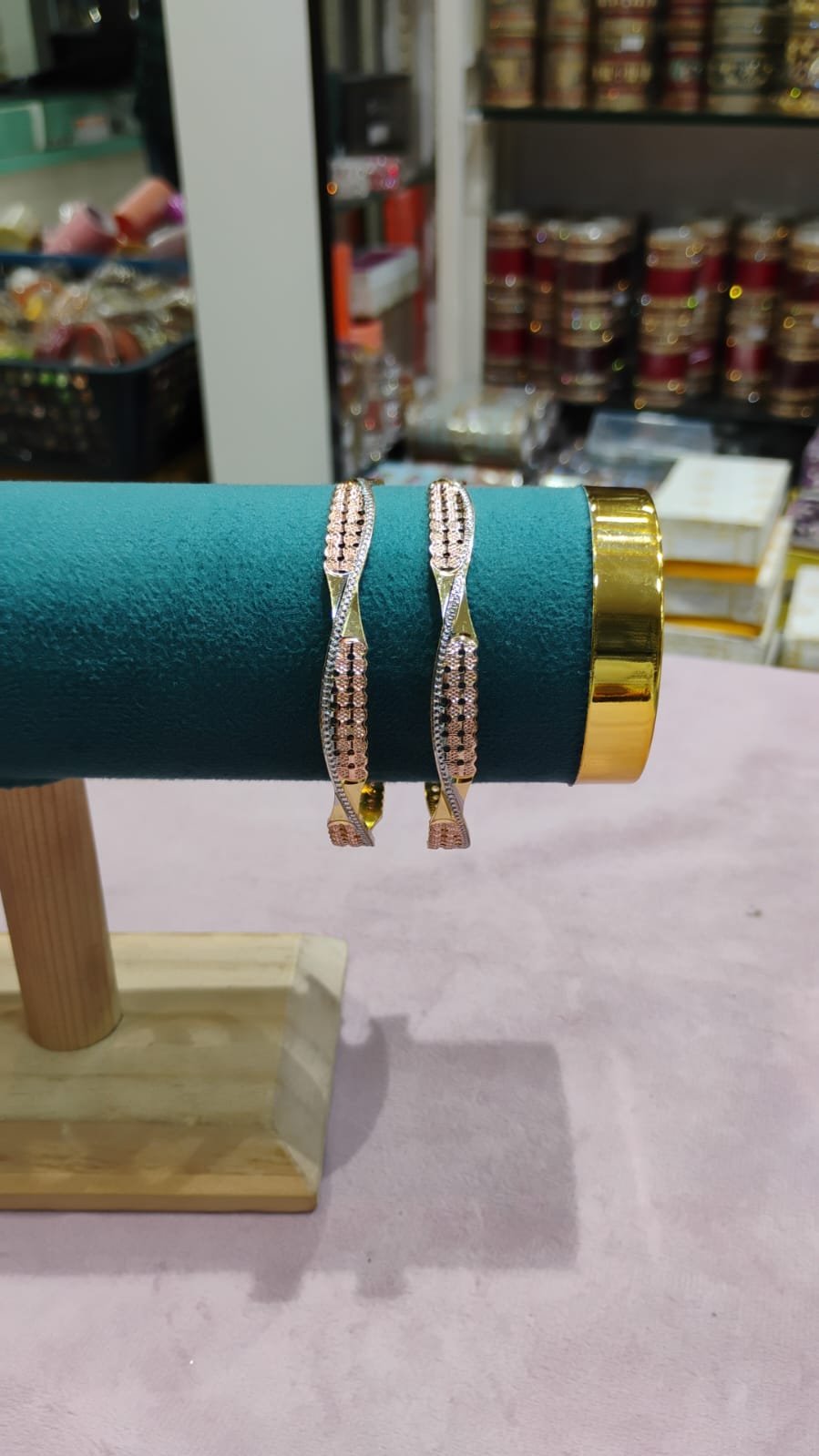 Add a touch of elegance to your jewelry collection with these beautifully crafted dual-tone designer bangles. Featuring a graceful combination of gold and rose-gold hues, these bangles are enhanced with fine textured patterns and delicate stone-like accents that create a rich and sophisticated look.