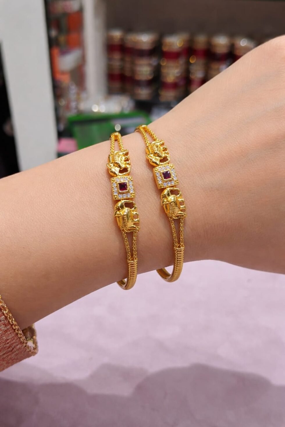 Beautiful gold-finish bangles featuring intricate elephant designs and a stunning ruby-stone centerpiece, perfect for traditional and festive wear.