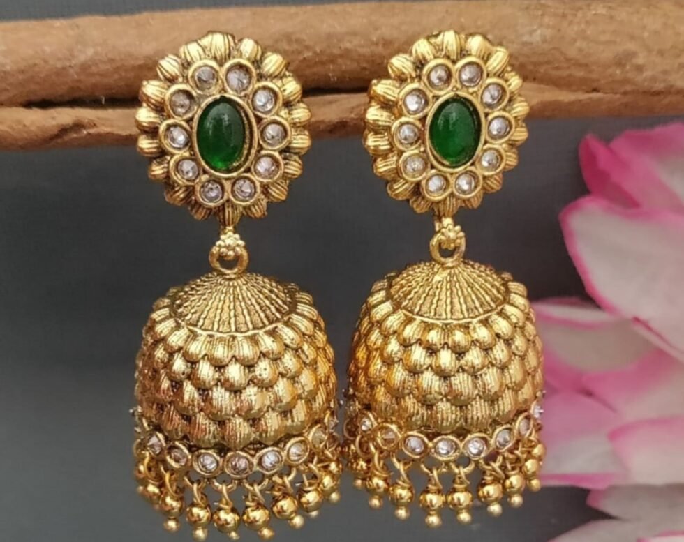 Stylish gold-plated jhumka earrings featuring a rich green center stone with sparkling accents and a beautifully textured dome design.