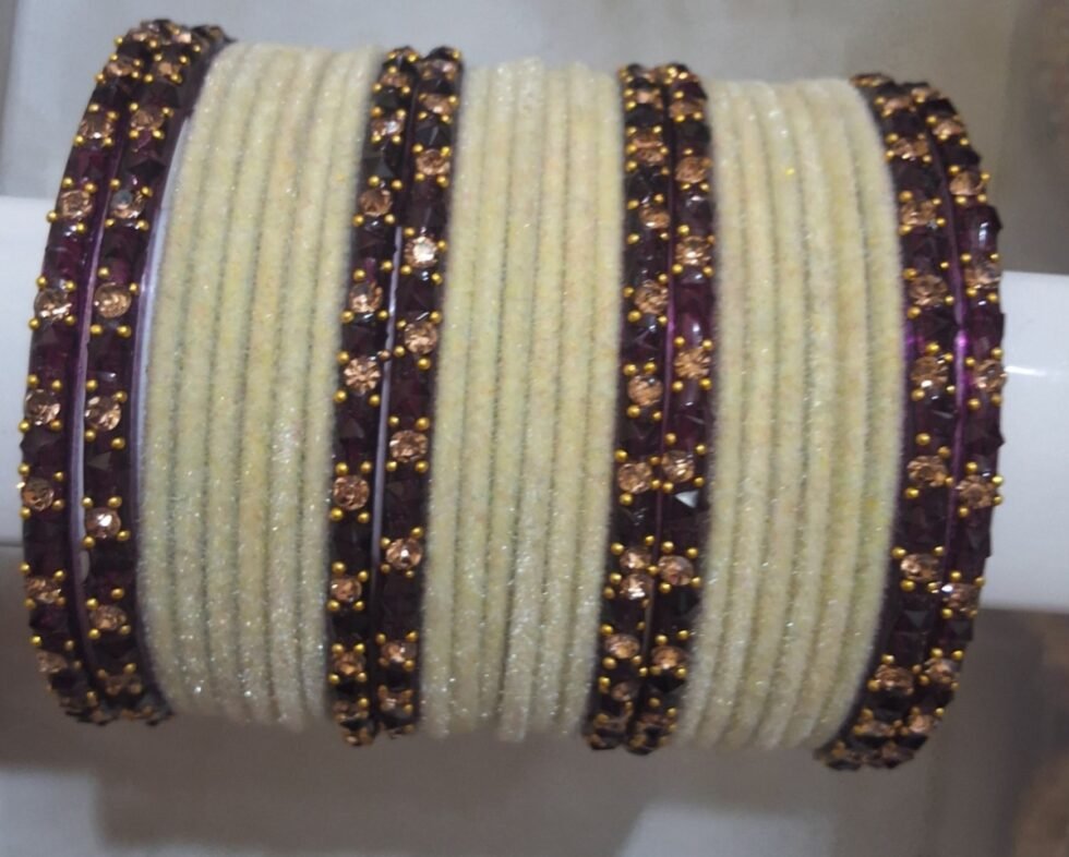 Complementing the statement bangles are soft cream-colored stack bangles that create a balanced and graceful contrast, making the entire set visually appealing and versatile. The combination of rich tones and delicate embellishments makes this set suitable for both traditional and modern outfits.