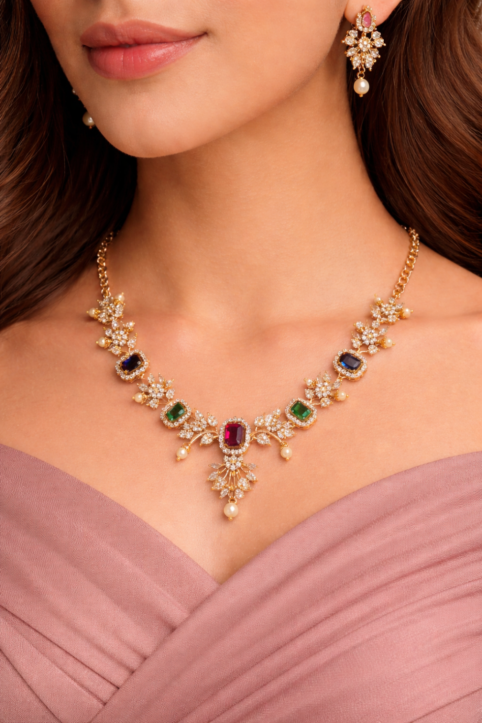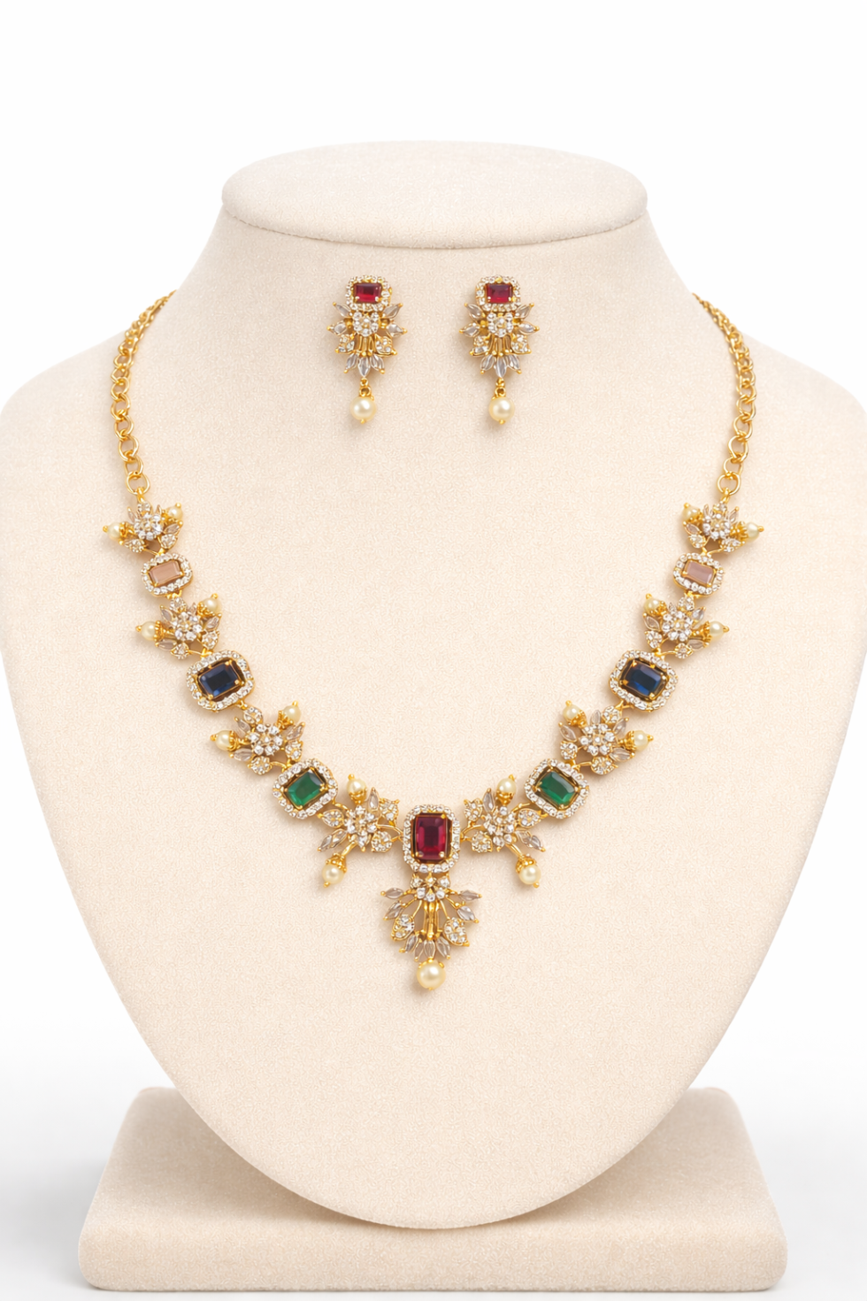 Elevate your jewelry collection with this beautifully crafted multicolor gemstone necklace set, designed to bring timeless elegance and sophistication to any look. The necklace features a graceful arrangement of square-cut stones in rich hues—ruby red, emerald green, and deep blue—each surrounded by sparkling crystal accents in an intricate floral pattern.