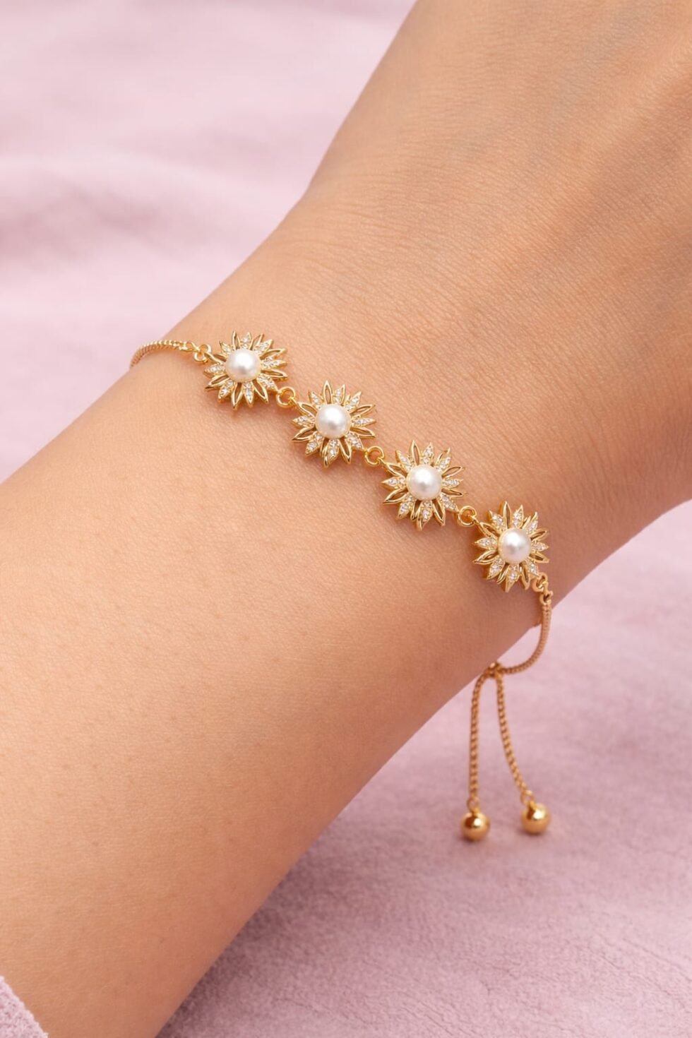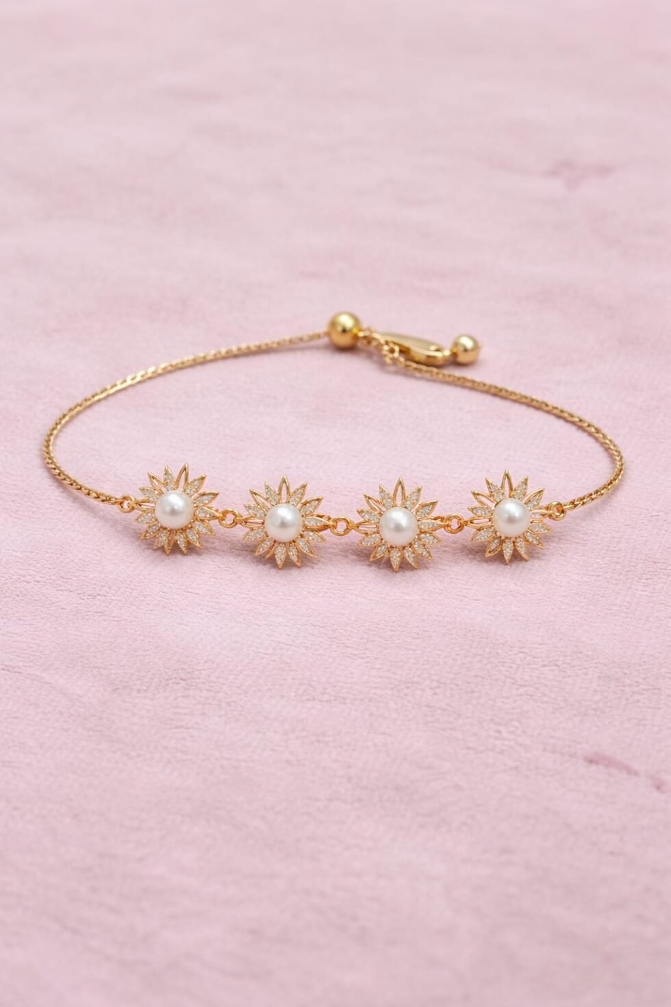 A stylish gold-plated bracelet featuring delicate sunburst designs with pearl centers. Perfect for adding a touch of elegance to everyday and special occasion outfits.