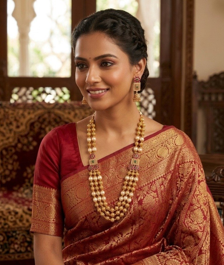 Elevate your ethnic look with this exquisitely crafted traditional long necklace set. Designed with a rich combination of gold-toned textured beads and glossy pearl accents, this piece reflects timeless elegance and heritage craftsmanship.