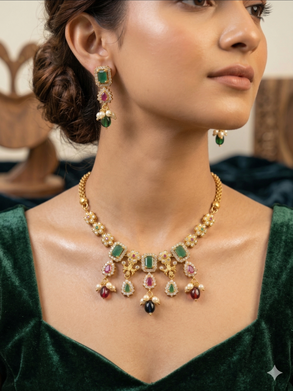 Elevate your ethnic look with this beautifully crafted traditional Kundan necklace set. Designed with a rich gold-tone finish, this exquisite set features a harmonious blend of green emerald-style stones and deep ruby accents, surrounded by sparkling white stones that enhance its royal appeal.
