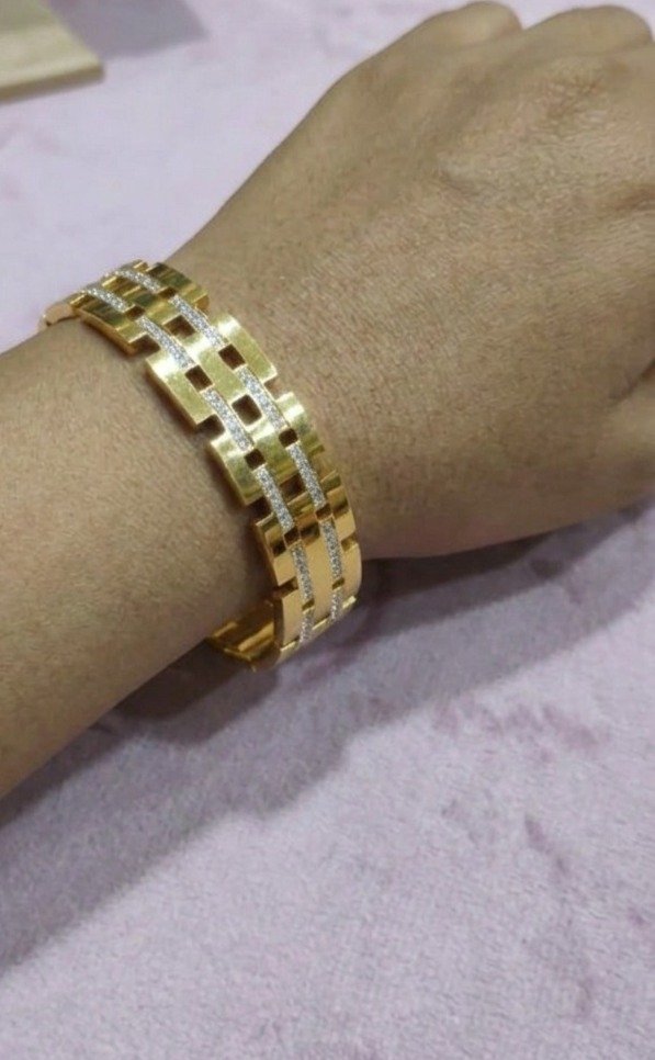 A striking gold-finished bangle featuring a bold, geometric cutout design. Inlaid with rows of shimmering clear crystals, this piece offers a perfect blend of vintage Art Deco inspiration and modern architectural style.