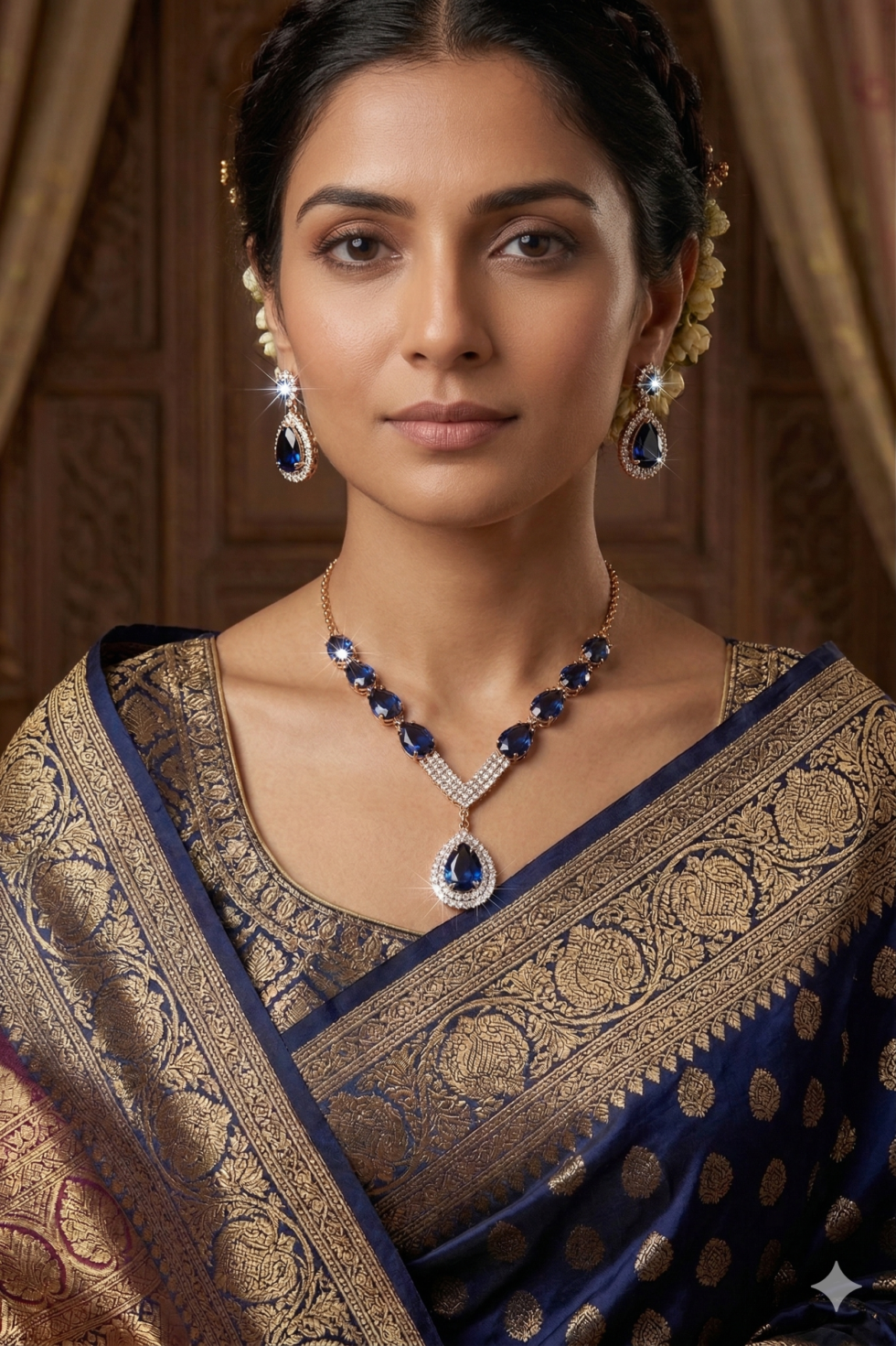 The matching earrings echo the necklace’s grace, featuring a clear crystal stud that descends into a bold sapphire drop. Whether paired with a modern evening gown or a traditional silk saree, this set is crafted to capture the light and become the focal point of any ensemble. Perfect for weddings, galas, or high-profile formal events