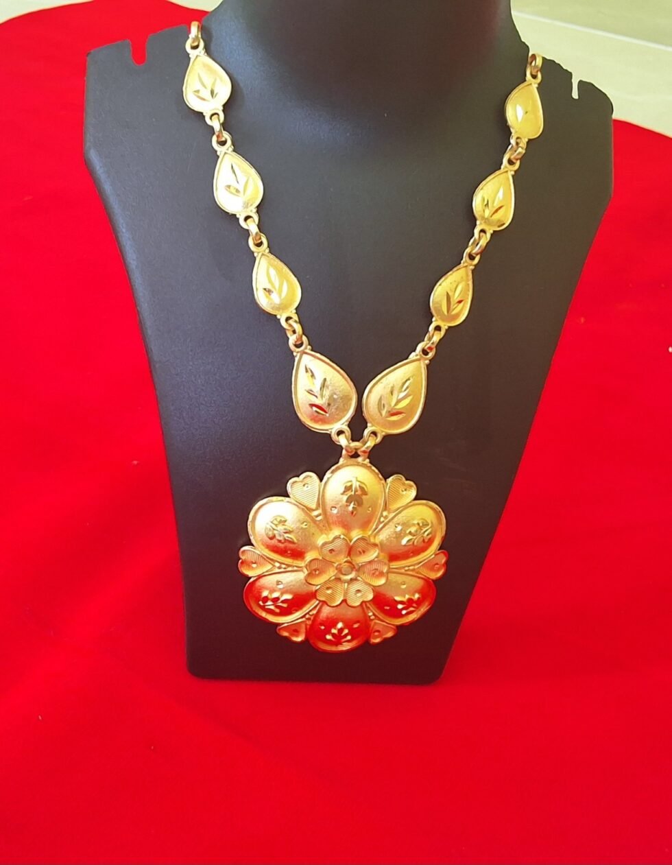 Add timeless elegance to your jewelry collection with this beautifully crafted traditional gold necklace set. Designed with a graceful chain of intricately detailed links, the highlight of this piece is its stunning floral pendant that reflects classic Indian artistry.
