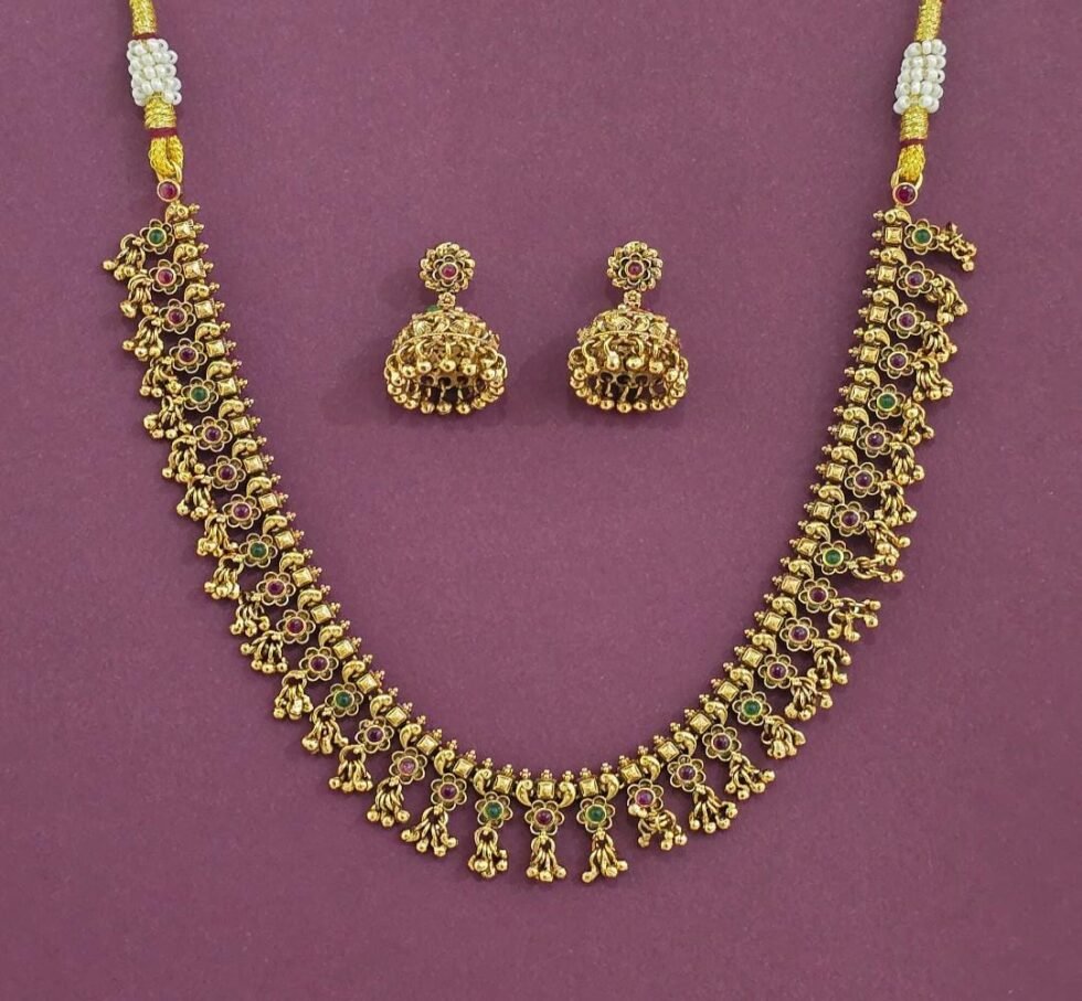 Add a touch of timeless elegance to your jewelry collection with this beautifully crafted traditional necklace set. Designed in a classic temple style, the necklace showcases intricate floral motifs adorned with rich ruby and green stone accents, giving it a regal and ethnic charm. The detailed craftsmanship is enhanced with delicate hanging elements that create graceful movement and elevate the overall look.